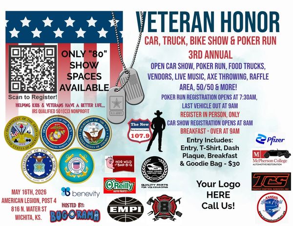 Veteran Honor – Car, Truck, Bike Show & Poker Run, 3rd Annual” – May 16th – Saturday morning breakfast, car show, vendors, food trucks, axe throwing, raffle area, 50/50, live music & more… Location: Thomas Hopkins American Legion Post # 4, Wichita. (New Venue)